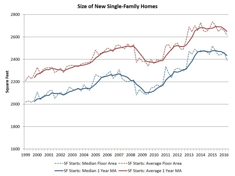 According to second quarter 2016 data from the Census Quarterly Starts and Completions by Purpose and Design and NAHB analysis, median single-family square floor area declined from 2,465 in the first quarter to 2,392 square feet for the second. Average (mean) square footage for new single-family homes fell from 2,658 to 2,616 square feet for the second quarter.